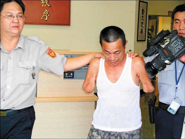 雙手手臂截肢的徐達富因長期盜領鄰居存款,昨被警方逮捕。(記者蔡彰盛攝)