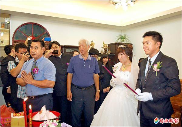 新娘父親張榮爵(左一)帶領林柏宏、張瓊文這對新人祭拜祖先。(記者陳建志攝)