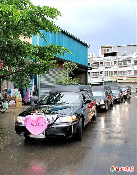 他特地向公司借來2輛凱迪拉克、1輛林肯牌的靈車,當作伴郎、伴娘的禮車,每輛售價超過400萬元,3輛靈車市價約1200萬元,加上3輛休旅車,迎娶車隊市價約1500萬元,原本放棺木的,如今是裝嫁妝。