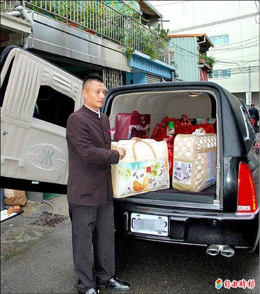 原本放棺木的靈車,變成裝滿嫁妝的禮車。(記者陳建志攝)