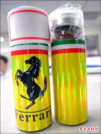 警方查扣印有法拉利標誌的不明成分提神飲料。(記者張協昇攝)