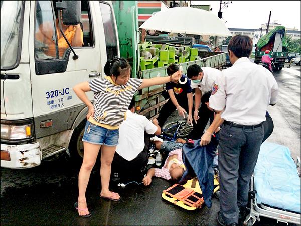 昨天下午兩點多,68歲游姓老翁騎乘單車到樹林區柑園街一帶,經柑園消防分隊後打算轉入巷內時,不慎與對向貨車發生擦撞,游翁小腿遭車輪捲入,痛得無法動彈,這時天空降下滂沱大雨,路邊經營早餐店的張小姐見狀,立刻打119報案,並衝上前替游翁及救護人員撐傘,直到傷者送上救護車,在大雨中站了15分鐘。