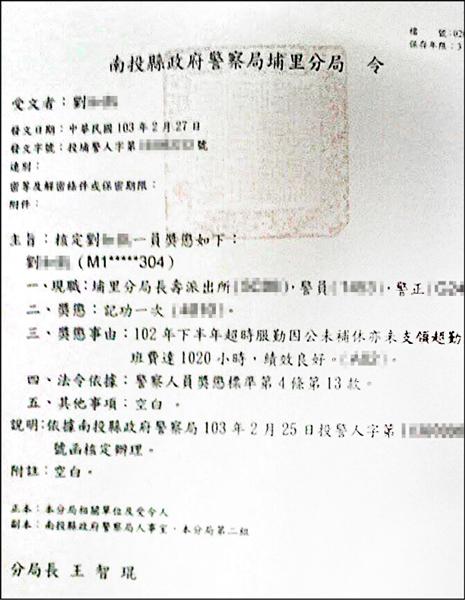 上月29日,陳明怡將埔里警分局一只公文PO網,內容為劉姓警員去年下半年超時服勤1020小時未補休,獲分局記小功1支。