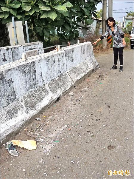嘉南大圳護墩遭到校車撞擊,泥塊散落一地。(記者林孟婷攝)