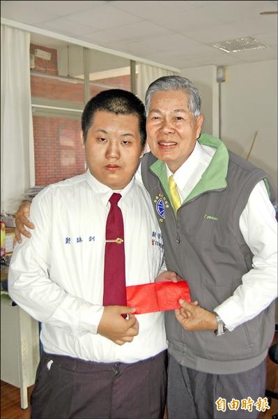 新榮中學高三生鄭詠釧(左)機警緊抓方向盤,勇救全車,校長胡學貴(右)發紅包壓驚、獎勵。(記者王涵平攝)