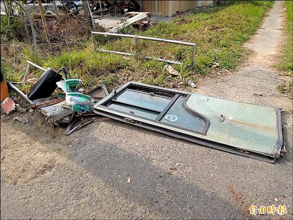 校車沿路撞到護墩、電線杆,車門不堪衝撞掉落路旁。(記者林孟婷攝)