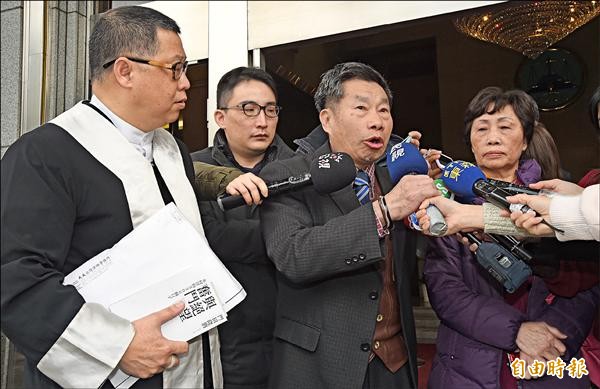 最高法院12日將八里雙屍案發回台灣高等法院更審。被害人陳進福的妹妹(右一)、妹婿(右二)在法院外痛批謝依涵根本沒有悔意,連對被害家屬點個頭都沒有。左一為律師魏憶龍。(記者劉信德攝)