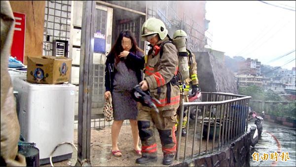 消防員緊急救援,救出受困火場樓上的一名孕婦。(記者林嘉東攝)