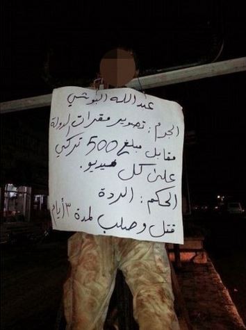 據反IS及一些支持IS的組織在社交網站上傳的照片顯示,有1名少年疑似曾遭毒打,身上佈滿傷痕、滿身鮮血,被釘在十字架上,脖子上還被掛著一塊板子,稱他每拍攝一張IS軍事基地照片,可賣得500土耳其里拉(約6771圓台幣),是IS組織的叛徒,最後還寫著:「判決:處決並釘在十字架上3天。」