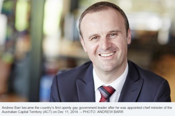 澳洲首都特區首席部長巴爾今天上任,直接公開同性戀身分。(圖擷取自the straits times)