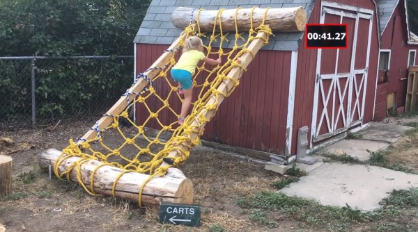 這位老爸蓋文(Gavin MacCall)去年為寶貝女兒萊拉(Lylah)在家中打造類似《極限體能王》的迷你版障礙賽關卡,今年更是把關卡搬到自家後院,用木板、樹幹、繩網、輪胎等材料搭建更高難度的賽道,萊拉也不辜負爸爸一片苦心,一路勇往直前挑戰,2分38秒便完成所有關卡。