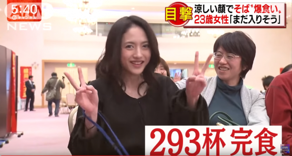 23歲美女小原尚子,才第一次參加就在短短15分內吞下了293碗蕎麥麵。(圖擷取自Youtube影片)