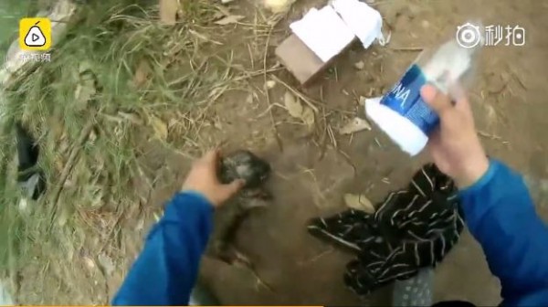 男子用切好的寶特瓶幫小狗做人工呼吸。(圖擷取自梨視頻)