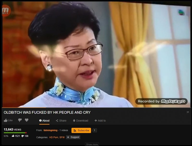 這段影片在本月13日被放上知名成人網站「PornHub」,標題為「OldBitch was fucked by hk people and cry」,翻做「老賤人被香港人X和哭出來」,影片播映至21日午夜零時,已有1萬3643人觀看,並有93%網友給予這段影片正面評價。