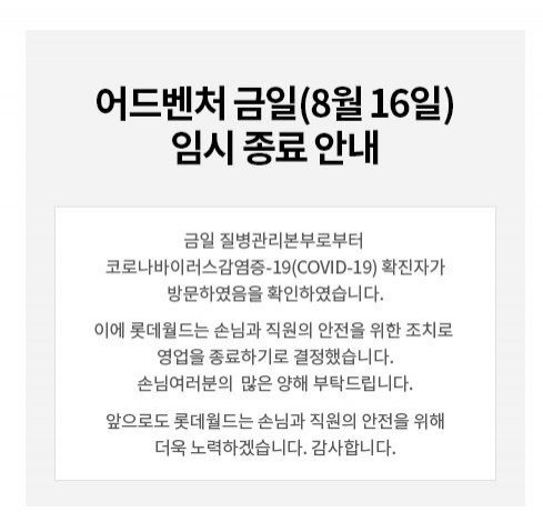位於南韓松坡區的主題樂園「樂天世界」在官網發布彈出式公告,表示「所有遊客請注意,今天從疾病管理本部接獲資訊,已確認有確診者參訪園區,為保護遊客及員工的安全,將臨時停止營業,盼各位旅客能諒解,未來樂天世界將繼續為您提供世界上最好的服務」。