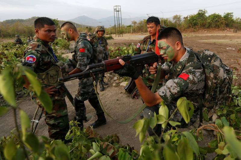 為防止中國軍方影響力持續提高,美國對柬埔寨實施武器禁運。圖為柬埔寨與中國士兵共同參與軍演。(路透)