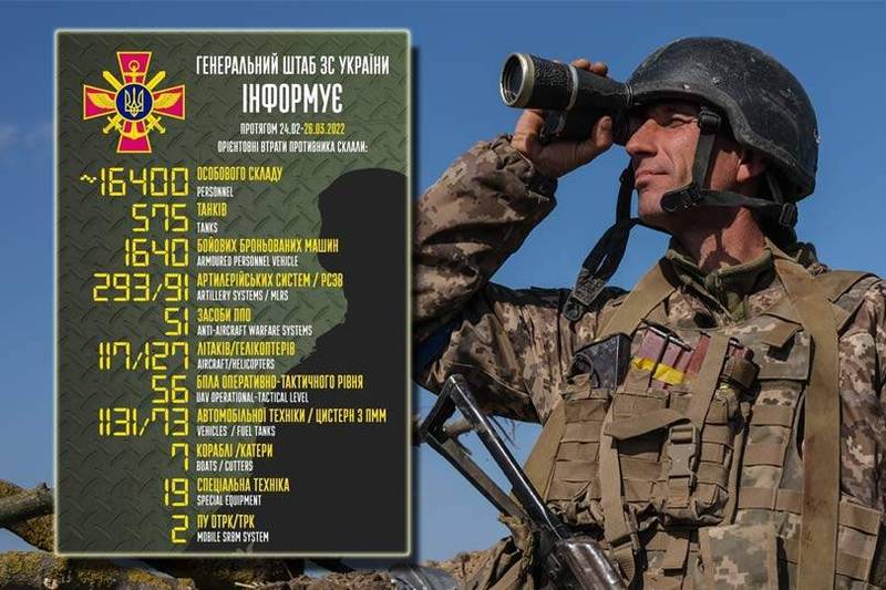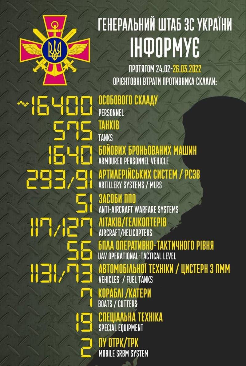 據烏克蘭武裝部隊總參謀部的臉書貼文指出,截至目前為止,俄軍約有1萬6400名士兵喪生、耗損575輛戰車、1640台裝甲車(APV)、293套火砲系統、91套多管火箭發射器、51套防空作戰系統、117架飛機、127架直升機、1131台機動車輛。