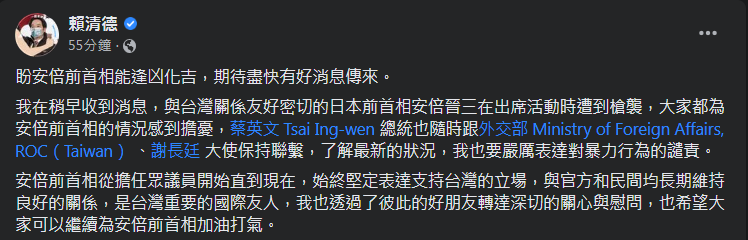 賴清德在臉書PO文表示,大家都對安倍晉三被槍擊後的狀況感到擔憂,蔡英文總統、駐日大使謝長廷與外交部也彼此保持聯繫,隨時了解此事的最新狀況,賴清德表示「嚴厲表達對暴力行為的譴責」。