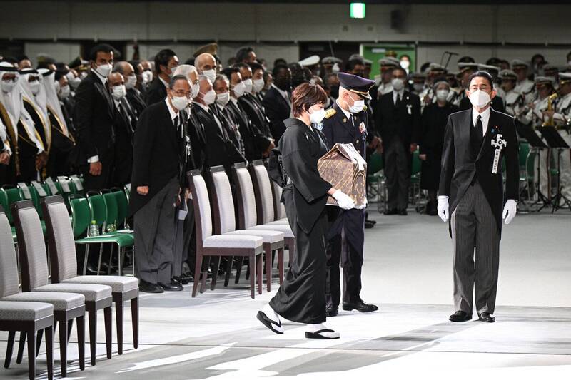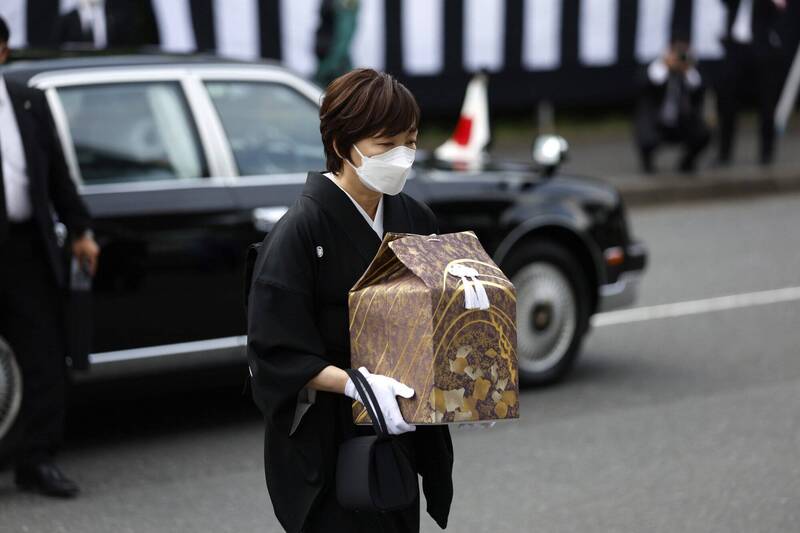 安倍晉三遺孀安倍昭惠捧著丈夫骨灰,進入國葬儀式現場。(歐新社)