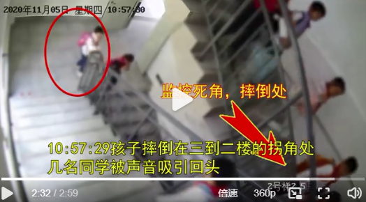 該名母親痛批,當事老師強拉郭姓男童下樓,並責備孩子不許哭,最後男童重摔在二樓轉角處,後腦勺就此受到強烈撞擊昏迷,送醫急救後不治身亡。(圖擷取自微博风往北吹y5)