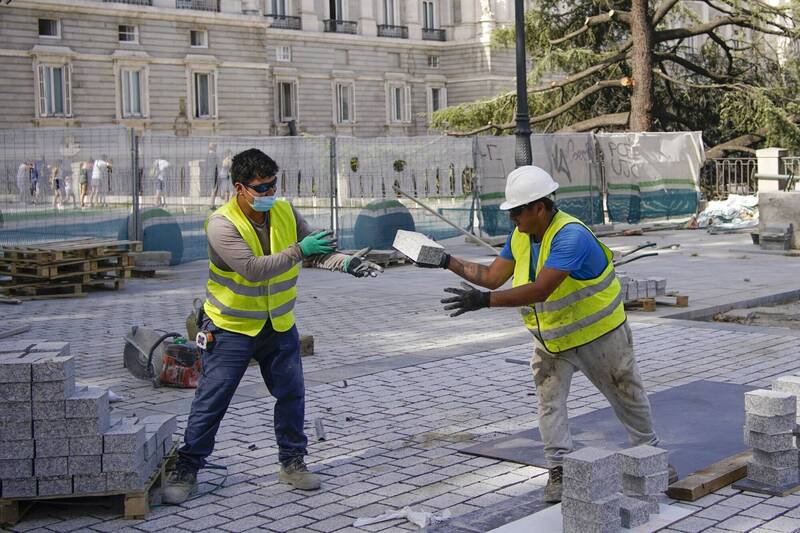 西班牙政府週三表示,計劃在極端高溫期間全面禁止戶外工作。圖為2021年8月馬德里遭熱浪侵襲,2名建築工人仍揮汗工作。(美聯社資料照)