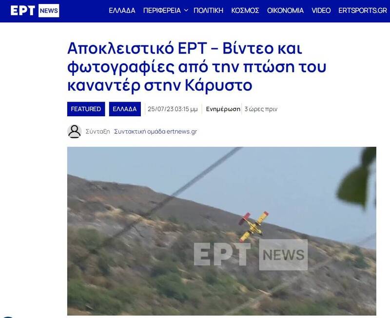 發言人阿托皮奧斯(Yannis Artopios)表示:「一架載有至少兩人的Canadair飛機在普拉塔尼斯托(Platanisto)附近墜毀。」普拉塔尼斯托是艾維亞島上一座村莊。