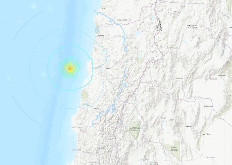 據美國地質調查所(USGS)指出,智利北部海岸附近於台灣時間今晨2點多發生芮氏規模5.7地震,震央位於阿塔卡馬大區的首府「科皮亞波」(Copiapo)以西121公里,深度僅4.9公里。截至目前尚未傳出有進一步災情。