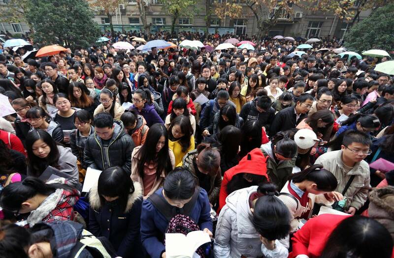 湖北、河南、江蘇等中國25省16至17日分別舉辦地方公務員招考的筆試,約有450萬名考生報考,錄取名額預計超過15萬個,錄取率不到3.5%。(法新社檔案照)