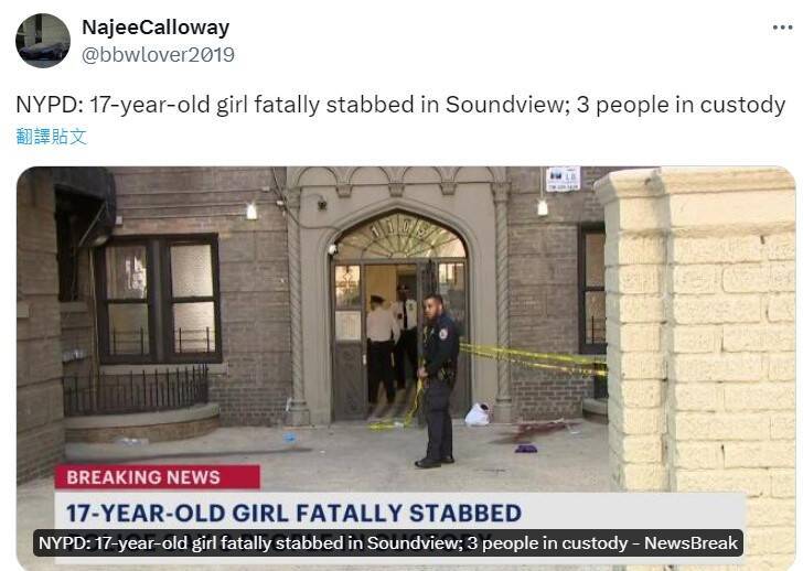 美國紐約17歲少女埃茉里遭他人持刀刺死,當地警察已逮捕3名嫌犯,目前拘留中。(圖擷自「@bbwlover2019」X)
