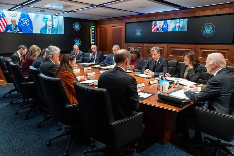 美國福斯新聞網(Fox News)報導,美國總統拜登將於當地時間5日在白宮戰情室與國家安全團隊會面,討論伊朗可能對以色列發動攻擊的情況,圖為2023年10月11日,哈瑪斯襲擊以色列4天後,拜登和國安團隊在白宮戰情室研商大計情形。(取自白宮X平台帳號)