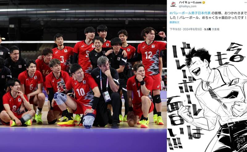 巴黎奧運男排項目8強賽今(5)日開打,日本男排2:3輸給義大利,遺憾止步8強賽,無緣晉級4強。賽後日本人氣運動作品《排球少年!!》(ハイキュー!!),其作者古舘春一透過社群平台「X」(原推特)發文,感謝在場上奮戰的日本男排選手們,同時感性說道,「今天的排球真是太有趣了!」