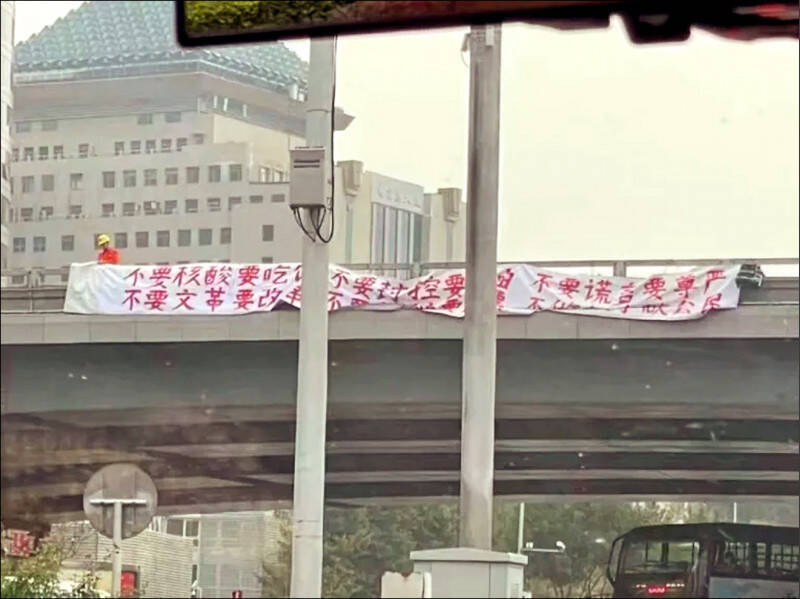 身著工人工作服的彭立發2022年10月13日在北京四通橋掛出白底紅字布條,呼籲「不要核酸要吃飯,不要封鎖要自由」、「不要謊言要尊嚴,不要文革要改革」、「不要領袖要選票,不做奴才做公民」,喊話「罷課罷工,罷免獨裁國賊習近平」,隨即被警察帶走,失聯至今兩年。(取自網路)