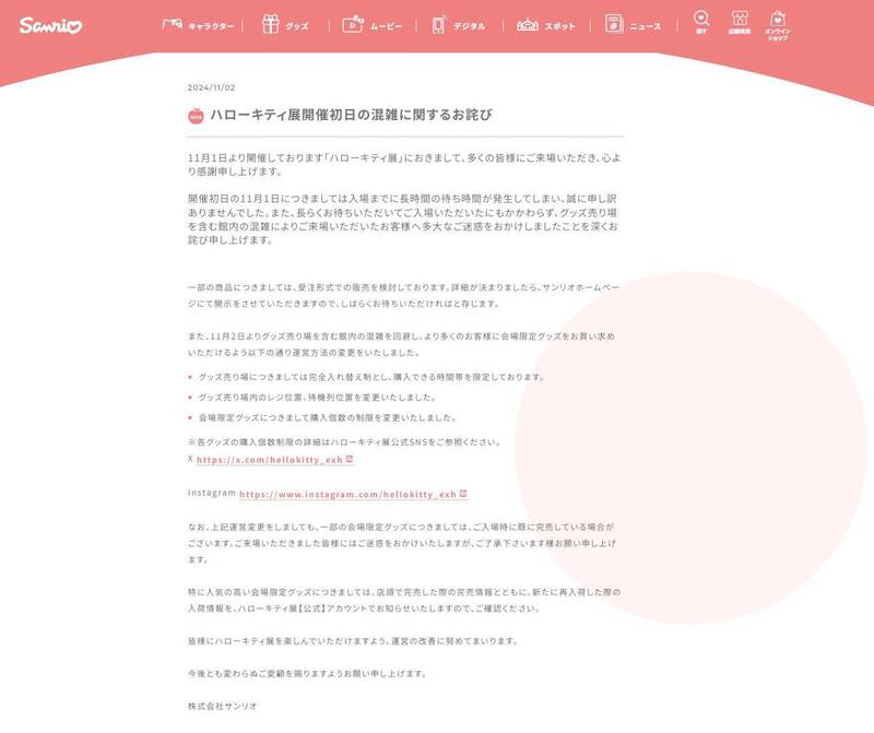 日媒指出,主辦單位三麗鷗株式會社事後亡羊補牢,在官網發布最新公告,除了表明本次特展商品嚴禁止轉售,更直白列出每一個人一次只能「限購50件商品」的規定,同時更改商品區的收銀與排隊位置,避免造成其他參觀遊客不便。不過公告發布後,還是引發許多日本網友質疑,認為只要這些中國黃牛繼續出動「人海戰術」到現場搶購,特展秩序仍會難以控制。