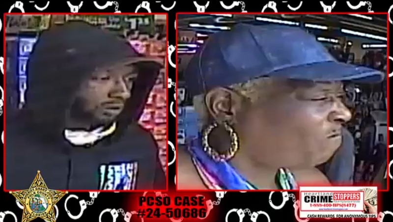美國佛州女子(右)進入1美元商店時,竟當眾大號掩護男性同夥(左)行竊逃逸。(圖擷自Polk County Sheriff「X」帳號)
