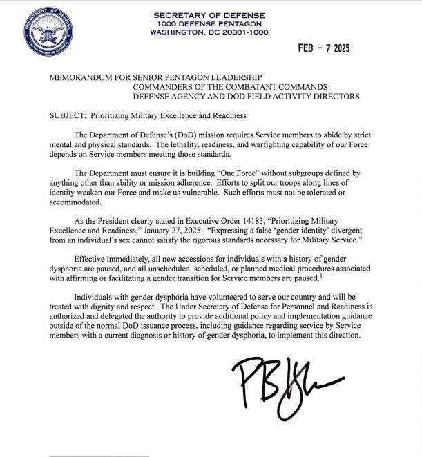 根據國防部長簽署的備忘錄,所有與確認或促進軍人「性別轉換」(gender transition)相關的醫療程序,包含已排定、未排定或計畫中的手術,都將暫停。備忘錄同時指出,患有性別不安的現役軍人「已自願為國效力,將會受到尊嚴與尊重」。