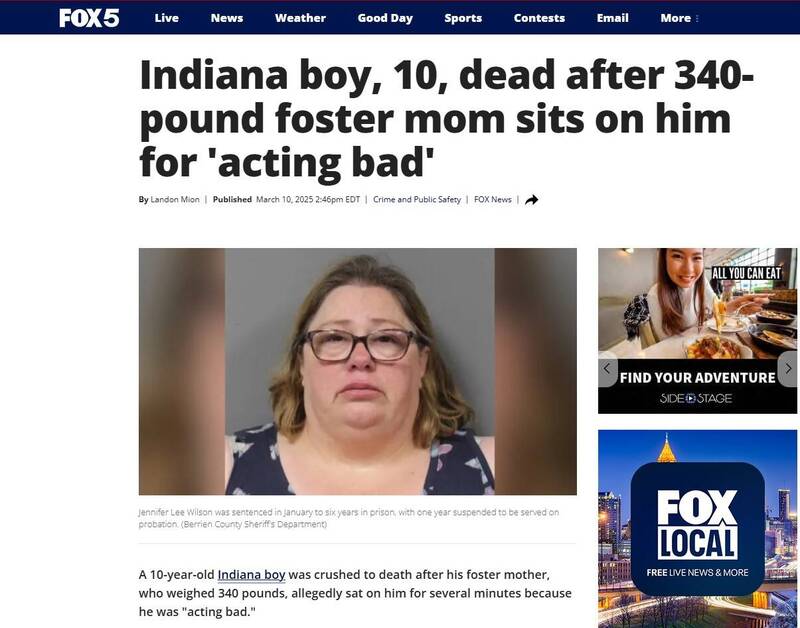 美國印第安納州發生一起令人悲痛的家庭慘案,一名體重飆破百公斤的女子,聲稱為教訓調皮的10歲養子,竟壓坐在他的身上5分鐘,導致養子喪命。該女日前被法院依過失殺人罪判處6年有期徒刑及1年緩刑。