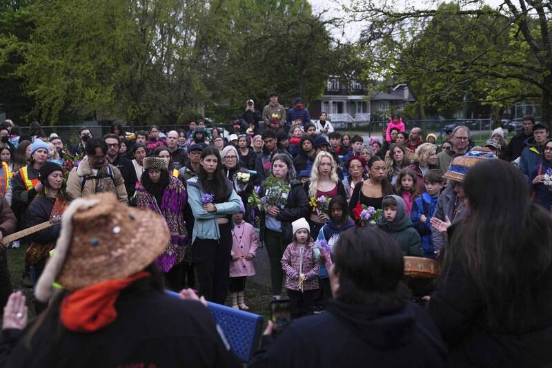 溫哥華汽車衝撞人群後,28日民眾聚集舉行悼念儀式。(美聯社)