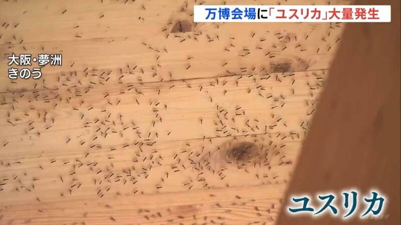 綜合日媒報導,社群平台5月出現大量大阪世博會場內「蟲蟲暴動」恐怖景象影片,可看到數量驚人的蚊蟲在空中亂竄,蟲屍則黏附在牆面與地上,遊客被迫用帽子、毛巾驅趕飛蟲。報導指出,蟲害主要集中在象徵性建築「大屋頂環」與海水圍出的「水上廣場」,蟲子數量也隨著氣溫升高急遽攀升。