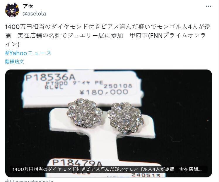 日本警方於近日逮捕4名蒙古籍嫌犯,涉嫌上月在山梨縣甲府市舉辦的珠寶展示銷售會中,竊取價值約1400萬日元(約新台幣280萬元)的鑽石耳環。(圖擷自「@aselola」X)