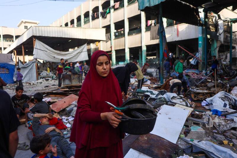 加薩市法赫米·賈爾賈維學校26日遭遇以色列空襲後,婦女於廢墟撿拾可用物品。救援人員稱,空襲造成至少52死,其中33人死於這所作為避難所的學校。(法新社)