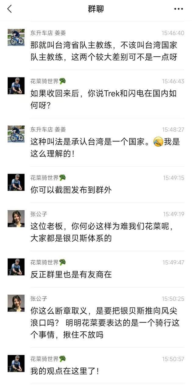 另外一張截圖則顯示,一名群組成員質疑「那就叫台灣省隊主教練,不該叫台灣國家隊主教練,這兩個較大差別可不是一點呀!」、「這種叫法是承認台灣是一個國家,我是這麼理解的!」然而,蔡正昌卻回覆「你可以截圖發佈到群外」、「反正群裡也是有友商在」,其他人則出面替蔡正昌講話,「這位老闆你何必這樣為難我們花菜呢?大家都是銀貝斯體系的」、「你這麼斷章取義,是要把銀貝斯推向風口浪尖嗎?明明花菜要表達的是一個騎行的事,揪住不放嗎?」蔡正昌則留下一句「我的觀點在這裡了!」