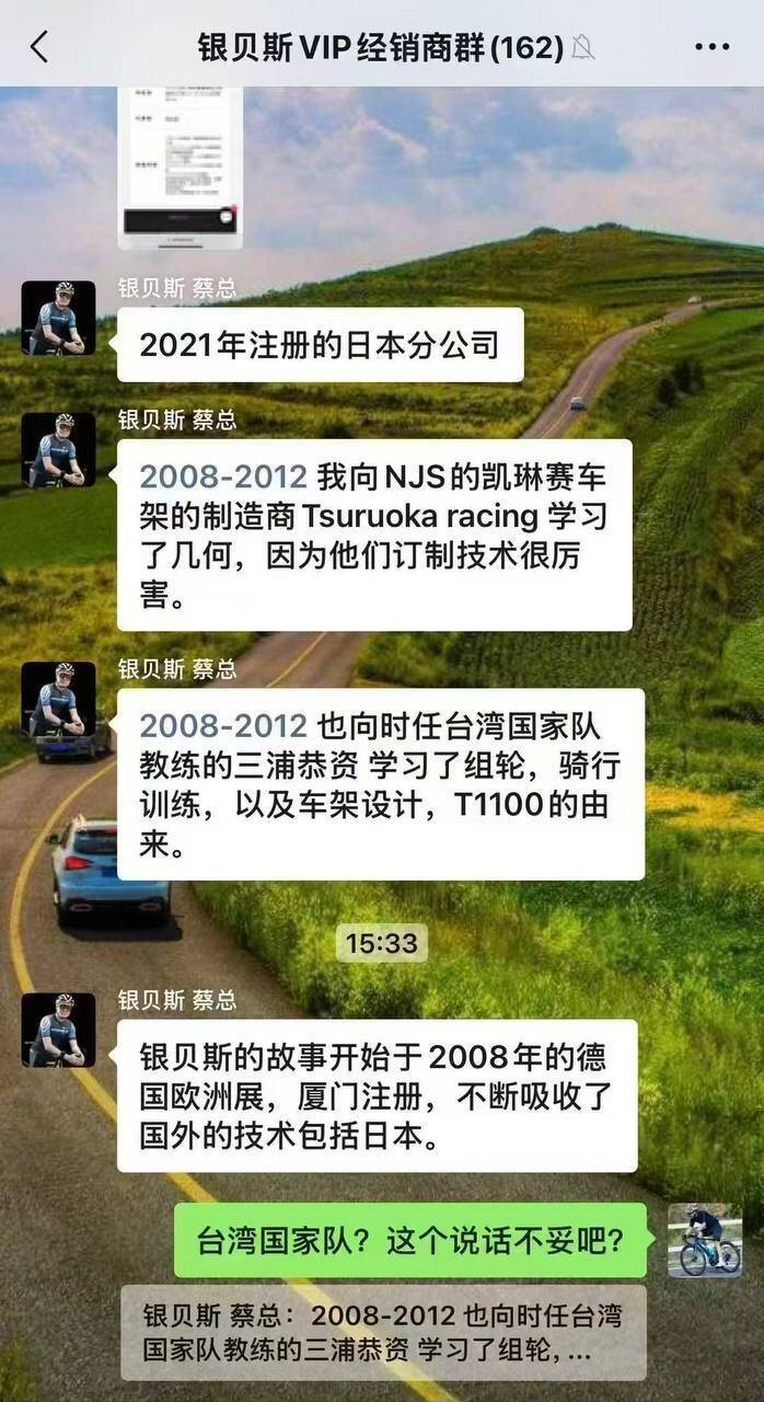蔡正昌日前在「銀貝斯VIP經銷商」群組提到,過去曾向時任「台灣國家隊」教練的三浦恭資學習組輪、騎行訓練及車架設計。不料「台灣國家隊」一詞立刻遭群組內成員質疑「這個說法不妥吧?」