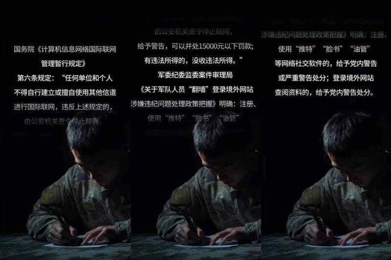 此外,根據中共軍委紀委監委案件審理局 《關於軍隊人員「翻墻」登錄境外網站涉嫌違紀問題處理政策把握》,內文也明確記載,若註冊或使用「推特」(現社群平台X)、「臉書」、「油管」(YouTube)等網絡社交軟件,違者會給予黨內警告或嚴重警告處分;登錄境外網站查閱資料者,則給予黨內警告處分。