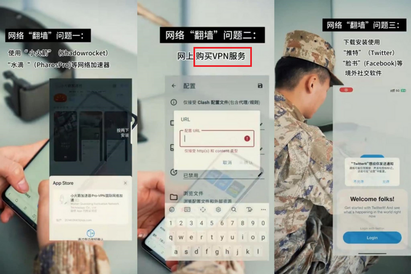 據悉,隸屬中共中央軍委的解放軍鄭州聯勤保障中心,曾在去年3月發布一段宣導用短影片,內容講述解放軍「范強」(諧音︰翻牆)為玩手機遊戲國際版、瀏覽中國以外的社群媒體,如何透過各種方式「違法翻牆」,像是下載小火箭(Shadowrocket)、水滴(PharosPro)等能突破網路地理封鎖的免費VPN,或是花錢購買VPN服務。