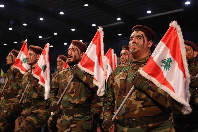 黎巴嫩真主黨(Hezbollah)部隊成員手持黎巴嫩國旗參與集會的資料照。(法新社資料照)
