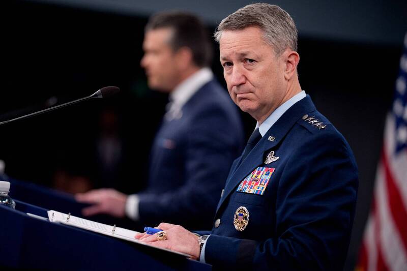 美國參謀首長聯席會議主席凱恩上將在五角大廈記者會上,詳述「午夜戰錘行動」攻擊伊朗核設施的完整時程。(美聯社)