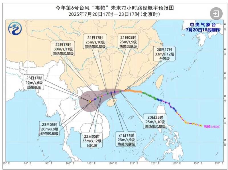中國中央氣象台今天上午針對颱風薇帕來襲,持續發布颱風橙色預警和暴雨橙色預警,指華東、華南沿海將出現強風豪雨,廣東省西部、海南島北部等局部地區將有特大豪雨。
