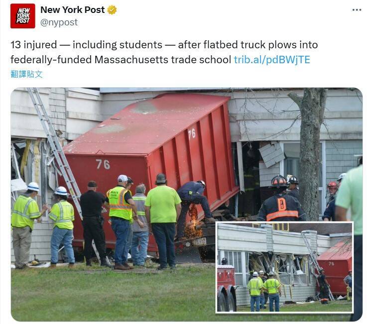 美國麻薩諸塞州週一上午驚傳車禍,1輛平板卡車失控衝入「施萊弗職業訓練中心」(Shriver Job Corps Center)園區內一棟大樓大廳,造成包含駕駛在內共13人受傷。(圖擷自「@nypost」X)