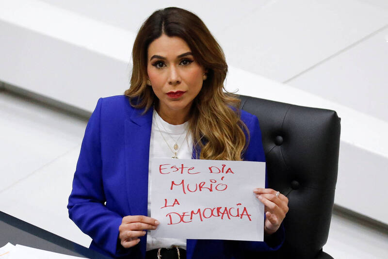 反對黨「國家共和聯盟黨」(NRA)議員維亞托羅拿著「民主已死」標語。(路透)