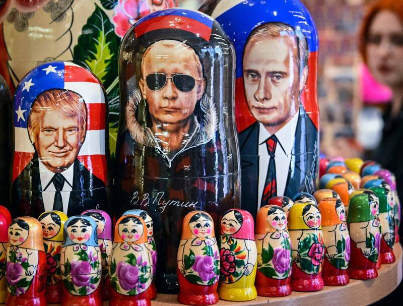 《法新社》15日報導,在莫斯科著名的亞巴特街(Arbat Street)一家觀光紀念品商店,美俄峰會前夕擺出以普廷和川普為形象的「俄羅斯娃娃」,並排陳列。莫斯科民眾高度期待這場會議,60歲稅務稽查員波里斯(Boris)說,「我想峰會上將做出正面決定,這場持續中的戰爭將會結束」。